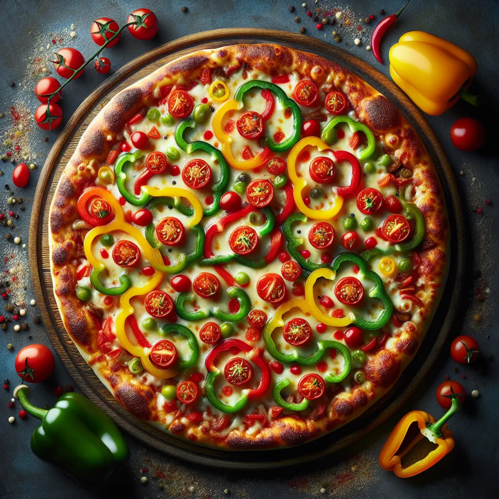 A colorful medley of crunchy bell peppers, juicy cherry tomatoes, and ooey-gooey mozzarella cheese, all baked on a crispy halal crust. This pizza isn’t just delicious; it’s a visual masterpiece designed to entice your taste buds.