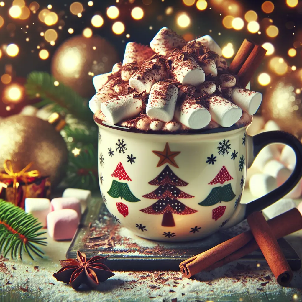 A creamy hot chocolate topped with a mountain of fluffy marshmallows and a sprinkle of chocolate shavings. A delightful drink that warms your heart after a day of play!
