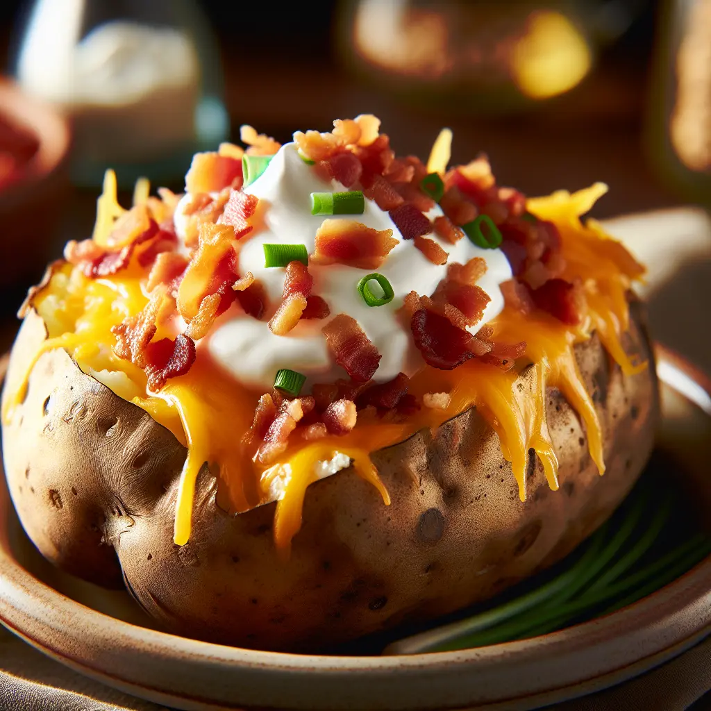 Baked potato stuffed with cheddar, crispy bacon bits, sour cream, and chives.